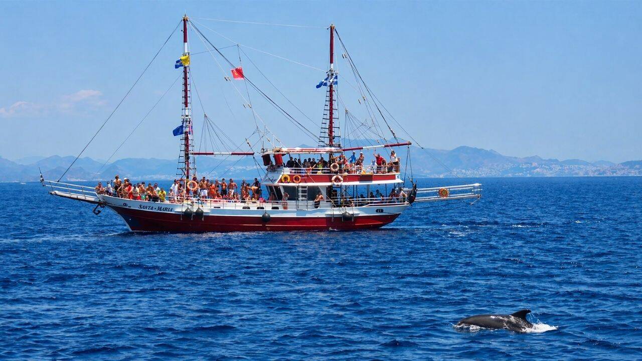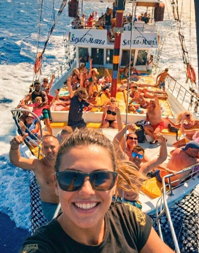 Santa Maria, is departing every day at 10:00 AM and returns at 5:30 PM. It is a double-decked boat with shaded areas and sunbeds where you can sunbathe.