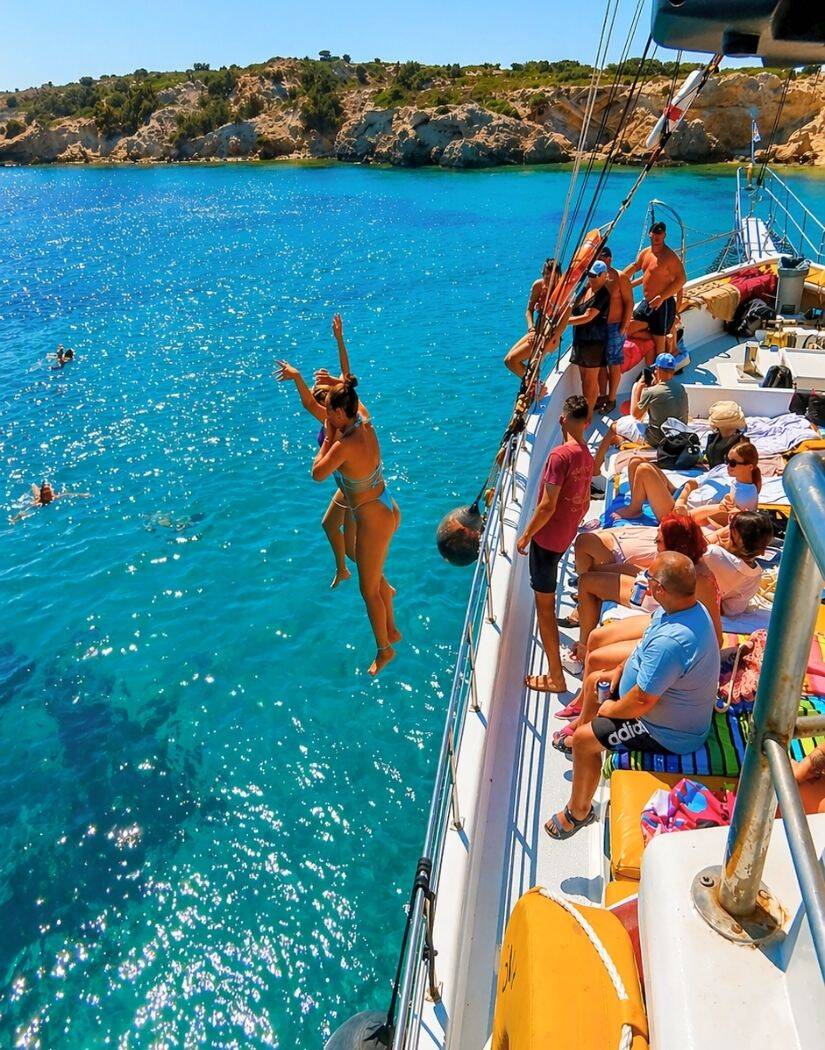 During the route, you have chance to see dolphins from the boat. You can jump into the sea from the upper deck’s diving platform.