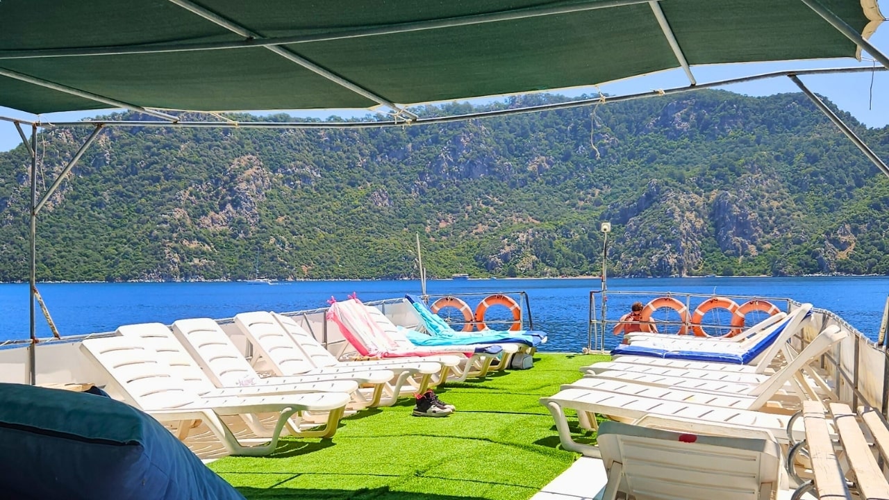 Boat departing from Antalya harbor has multiple shaded seating places. You can sit comfortably while seeing lovely buildings and charming shops of the Turkish riviera from the boat.