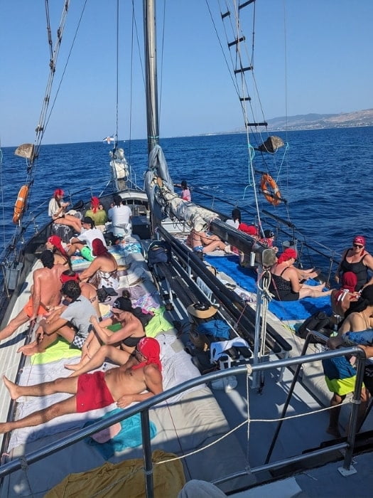 At the back of the boat, there are stairs to the second deck and on the side for getting into the sea. Each participant is guaranteed a sunbathing mat and a chair.