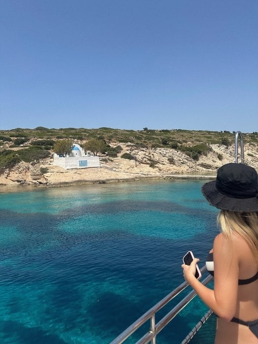 You can visit the Agios Nikolaos Church on the island. Also, if you’re lucky, you might see dolphins during the tour route. If dolphins are spotted around the boat, the crew will notify you so you can take photos.