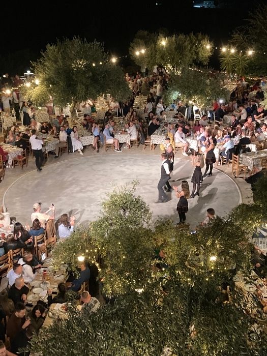 The Greek Night takes place at the scenic Fantasia Restaurant, located in the mountain village of Zia. From here, you can enjoy a stunning view of the Zia sunset, all while indulging in delectable Greek cuisine, fine wines, and lively traditional dance performances over the course of four delightful hours.