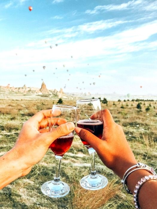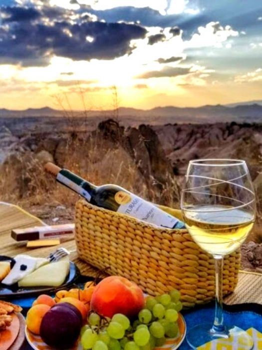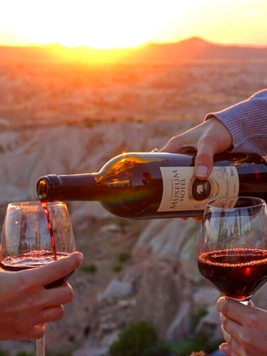 Your guide will lead you through the rock formations to the spot where you can best take advantage of the sunset. There you can pop the cork on your wine, share snacks and a glass of wine, tasting red (or white) Cappadocia wine and toast the setting sun as it drops behind the mountains of Goreme. Your guide will then take you to your waiting transport and back to your hotel, your senses filled with the views of a lifetime.