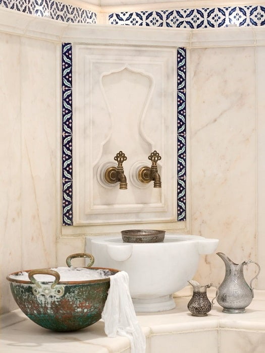 When this is complete, you will then be taken to the ‘belly stone’ of the Hamam.  This is the domed room, wherein lies a marble belly stone for your scrub and massage to take place.  If you are next in line as it were, there will be marble seats around the room, together with cold water basins and dishes, with which you may cool yourself while awaiting your turn on the belly stone.