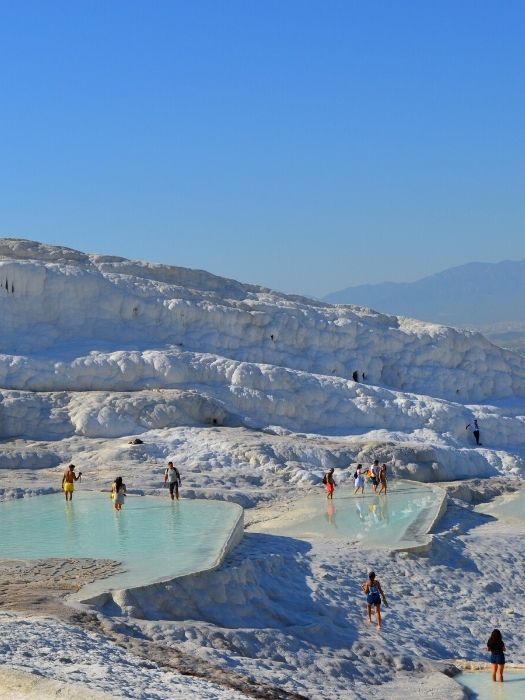 The travertines or rock terraces, remain white because you are not allowed to wear any footwear at all when walking on them. This is not a problem as they are neither sharp nor slipper. It is advisable to take a bag to carry your shoes in when you are on the rock pools. Despite appearing daunting the climb is a gentle one that most people can comfortably undertake.