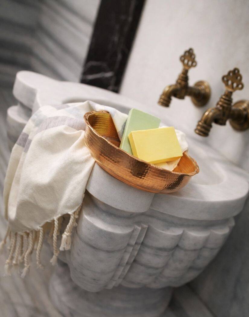 Once you are changed you will be taken to the Sauna or Steam Room to begin the opening of the pores. This is an essential part of the Turkish Bath as it opens the pores and releases the toxins built up in your skin. This usually takes around 15 minutes, after which you will be taken to the main Hamam where you will see the ‘belly stone’ made of marble and placed beneath the domed roof for maximum heat. Around the stone are many smaller marble seats with basins of cold water. As you await your turn on the stone you can cool off using the brass basins provided, while you watch your predecessor’s Hamam treatment take place.