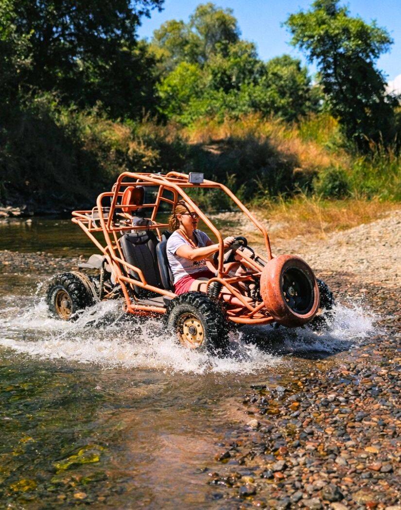 With the lower seating, driver and passenger are bound to get wet when riding through the river, but on a hot day, this can be a welcome reprieve from the heat. Riding through the beautiful mountain scenery above the city of Marmaris can be a liberating adrenalin experience. The buggies seem to travel fast because of their light weight and lower bearing, but are actually no faster or slower than their heavier quad counterparts, although perhaps a lot more fun!