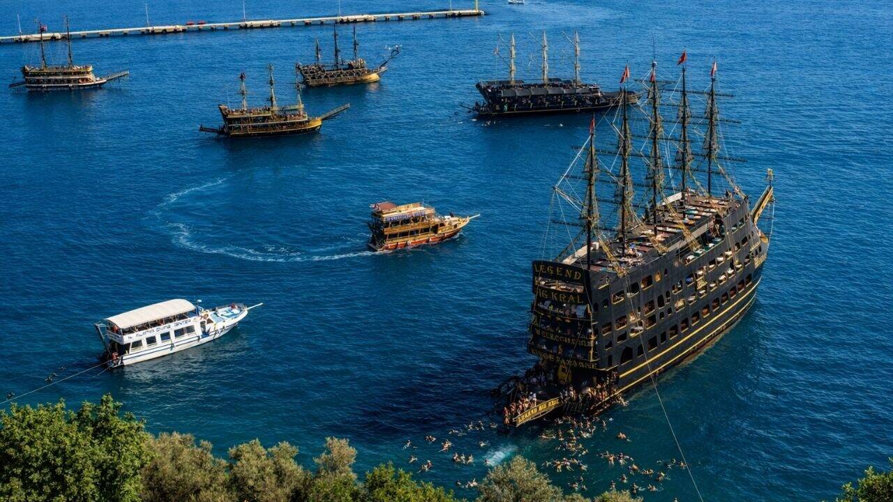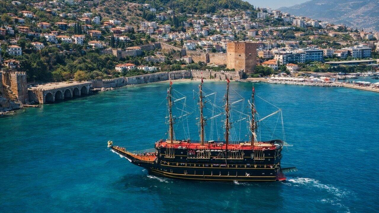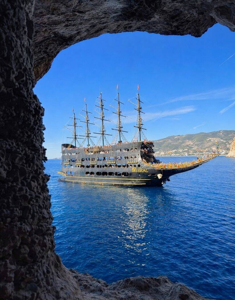 Side Big Kral boat trip is more than just a regular boat ride. You will set sail on a huge pirate ship with tall masts across the azure waters of the Mediterranean Sea. Big Kral means “Big King” in Turkish. It is a huge ship indeed, very imposing. A comfortable minibus will take you in the morning to the port near Türkler. You will visit the most beautiful bays and grottoes and have a great time swimming and sunbathing. Then the boat will take you to Alanya city centre where you will have free time while the kitchen team prepares a delicious lunch for you. It will be served as a buffet with drinks, so no one will be left hungry or thirsty.