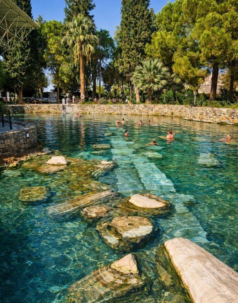 The second part of the trip is a visit to Pamukkale National Park. Pamuk means cotton in Turkish and kale means castle. This is why Pamukkale is often called the Cotton Castle. Pamukkale is another wonder of the varied nature of Turkey – snow-white hillsides, decorated with all kinds of niches and travertine balconies, through which the blue water* flows endlessly.