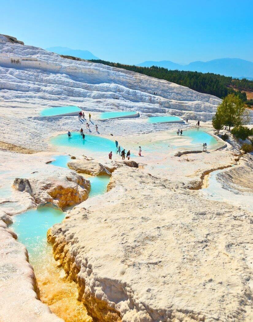 The travertines or rock terraces, remain white because you are not allowed to wear any footwear at all when walking on them. This is not a problem as they are neither sharp nor slipper. It is advisable to take a bag to carry your shoes in when you are on the rock pools. Despite appearing daunting the climb is a gentle one that most people can comfortably undertake.